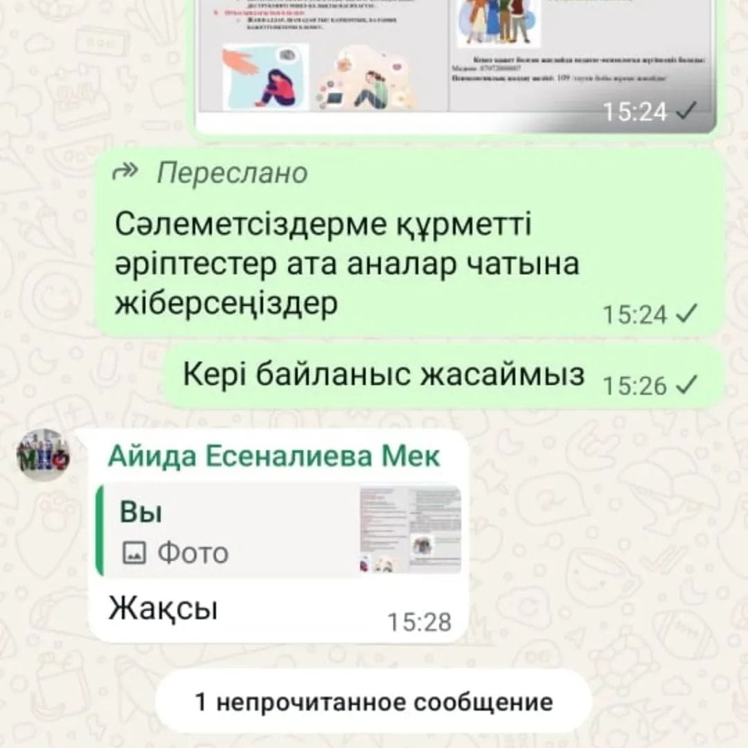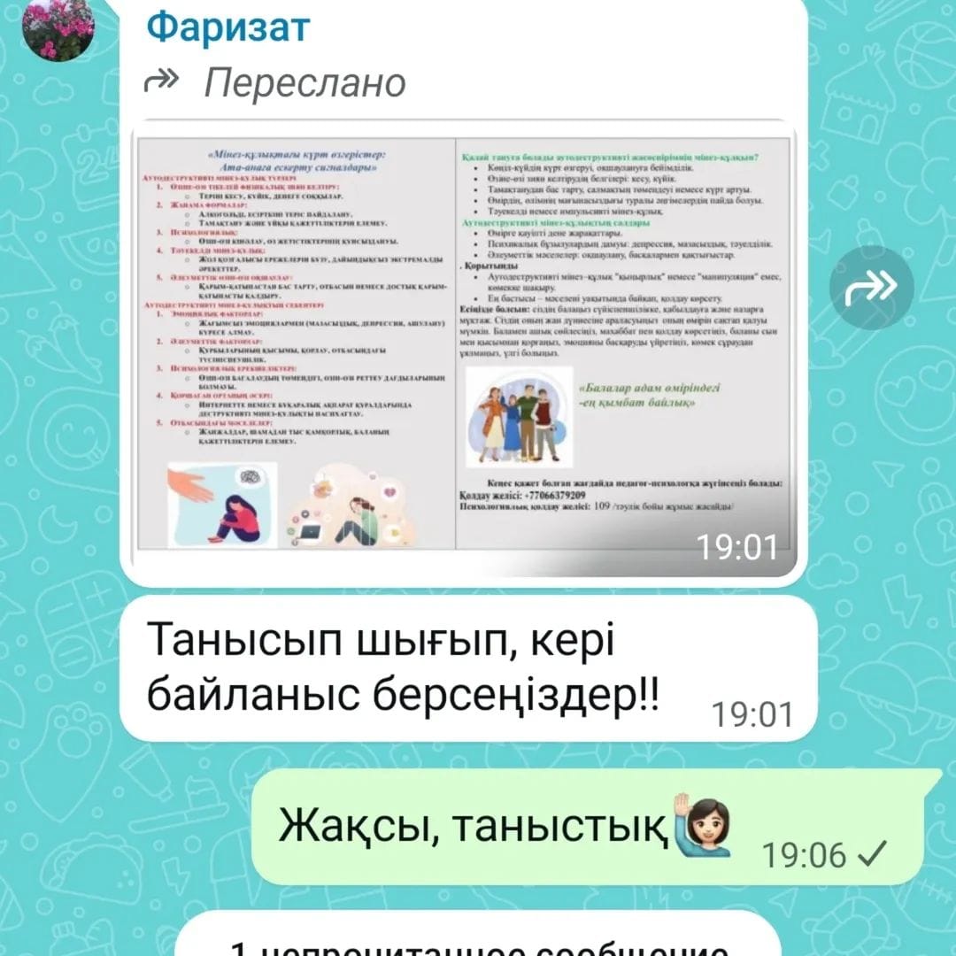 Шу ауданының білім бөліміне қарасты Еңбекші орта мектебінде,2025 жылдың қараша айында жасөспірімдер арасында , аутодеструктивті мінез-құлықтың алдын алу бойынша , ата-аналарға “Мінез-құлықтағы күрт өзгерістер; ата-анаға ескерту синалдары” тақырыбында психологиялық жадынама таратылып, ата-аналардан кері байланыс алынды.